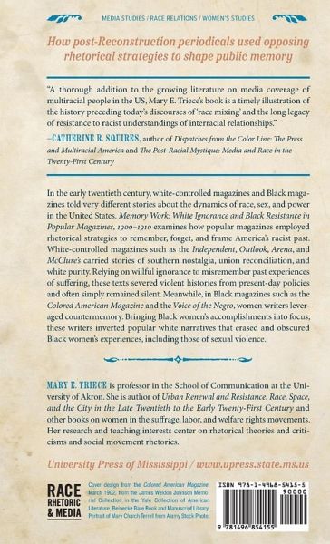 In the early twentieth century, white-controlled magazines and Black magazines told very different stories about the dynamics of race, sex, and power in the United States. Memory Work: White Ignorance and Black Resistance in Popular Magazines, 1900-1910 examines how popular magazines employed rhetorical strategies to remember, forget, and frame America's racist past. White-controlled magazines such as the Independent, Outlook, Arena, and McClure's carried stories of southern nostalgia, union reconciliation, and white purity. Relying on willful ignorance to misremember past experiences of suffering, these texts severed violent histories from present-day policies and often simply remained silent. Meanwhile, in Black magazines such as the Colored American Magazine and the Voice of the Negro, women writers leveraged countermemory. Bringing Black women's accomplishments into focus, these writers inverted popular white narratives that erased and obscured Black women's experiences, including those of sexual violence. Mary E. Triece traces how white and Black magazines--often in dialogue with one another--differently engaged memory work to either reinforce or upend white supremacy during a period of both Black advancement and white backlash. Further, the book suggests lines of connection between the construction of public memory in the past to those taking place today across an array of media platforms. Popular debates--whether appearing in early 1900s magazines or on twenty-first-century social media sites--shape a culture's collective knowledge of what counts as true, important, and worthy of attention.