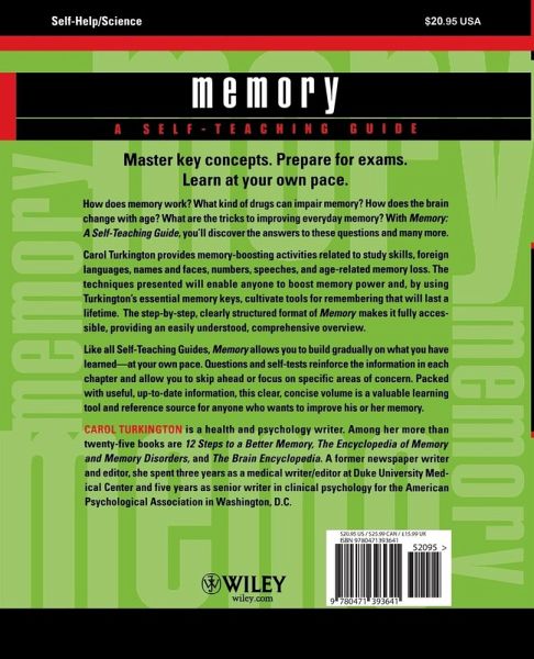 * Master the 3 keys of memory * Boost memory power with self-tests * Remember everything better, from names and faces to articles and speeches Master key concepts. Prepare for exams. Learn at your own pace. How does memory work? What kind of drugs can impair memory? How does the brain change with age? What are the tricks to improving everyday memory? With Memory: A Self-Teaching Guide, you?ll discover the answers to these questions and many more. Carol Turkington provides memory-boosting activities related to study skills, foreign languages, names and faces, numbers, speeches, and age-related memory loss. The techniques presented will enable anyone to boost memory power and, by using Turkington?s essential memory keys, cultivate tools for remembering that will last a lifetime. The step-by-step, clearly structured format of Memory makes it fully accessible, providing an easily understood, comprehensive overview. Like all Self-Teaching Guides, Memory allows you to build gradually on what you have learned?at your own pace. Questions and self-tests reinforce the information in each chapter and allow you to skip ahead or focus on specific areas of concern. Packed with useful, up-to-date information, this clear, concise volume is a valuable learning tool and reference source for anyone who wants to improve his or her memory.