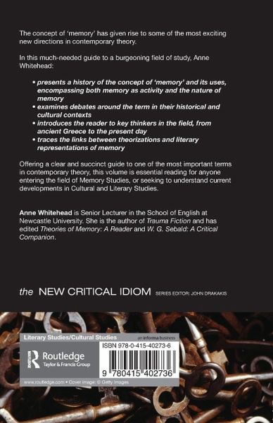 The concept of memory has given rise to some of the most exciting new directions in contemporary theory. In this much-needed guide to a burgeoning field of a study, Anne Whitehead: presents a history of the concept of memory and its uses, encompassing both memory as activity and the nature of memory examines debates around the term in their historical and cultural contexts introduces the reader to key thinkers in the field, from ancient Greece to the present day traces the links between theorisations and literary representations of memory Offering a clear and succinct guide to one of the most important terms in contemporary theory, this volume is essential reading for anyone entering the field of Memory Studies, or seeking to understand current developments in Cultural and Literary Studies.
