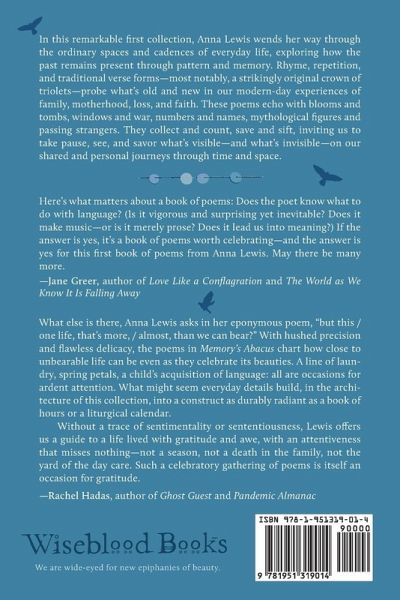 In this remarkable first collection, Anna Lewis wends her way through the ordinary spaces and cadences of everyday life, exploring how the past remains present through pattern and memory. Rhyme, repetition, and traditional verse forms-most notably, a strikingly original crown of triolets-probe what's old and new in our modern-day experiences of family, motherhood, loss, and faith. These poems echo with blooms and tombs, windows and war, numbers and names, mythological figures and passing strangers. They collect and count, save and sift, inviting us to take pause, see, and savor what's visible-and what's invisible-on our shared and personal journeys through time and space. Here's what matters about a book of poems: Does the poet know what to do with language? (Is it vigorous and surprising yet inevitable? Does it make music-or is it merely prose? Does it lead us into meaning?) If the answer is yes, it's a book of poems worth celebrating-and the answer is yes for this first book of poems from Anna Lewis. May there be many more. --Jane Greer, author of Love Like a Conflagration and The World as We Know It Is Falling Away What else is there, Anna Lewis asks in her eponymous poem, "but this / one life, that's more, / almost, than we can bear?" With hushed precision and flawless delicacy, the poems in Memory's Abacus chart how close to unbearable life can be even as they celebrate its beauties. A line of laundry, spring petals, a child's acquisition of language: all are occasions for ardent attention. What might seem everyday details build, in the architecture of this collection, into a construct as durably radiant as a book of hours or a liturgical calendar. Without a trace of sentimentality or sententiousness, Lewis offers us a guide to a life lived with gratitude and awe, with an attentiveness that misses nothing-not a season, not a death in the family, not the yard of the day care. Such a celebratory gathering of poems is itself an occasion for gratitude. --Rachel Hadas, author of Ghost Guest and Pandemic Almanac