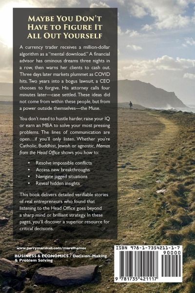 Maybe You Don't Have to Figure It All Out Yourself A currency trader receives a million-dollar algorithm as a "mental download." A financial advisor has ominous dreams three nights in a row, then warns her clients to cash out. Three days later markets plummet as COVID hits. Two years into a bogus lawsuit, a CEO chooses to forgive. His attorney calls four minutes later-case settled. These ideas did not come from within these people, but from a power outside themselves-the Muse. "God's got multiple memos in your message box awaiting your immediate response. Perry's book will introduce them to you, help you effectively see them, and make your life infinitely more interesting, important, and impactful now. This book will inspire you to release all of your memos that have been in a holding pattern." -Mark Victor Hansen, co-creator of the Chicken Soup for the Soul, One Minute Millionaire, and Ask! book series selling over a half billion books You don't need to hustle harder, raise your IQ or earn an MBA to solve your most pressing problems. The lines of communication are open . . . if you'll only listen. Whether you're Catholic, Buddhist, Jewish, or agnostic, Memos from the Head Office shows you how to: Resolve impossible conflicts Access new breakthroughs Navigate jagged situations Reveal hidden insights This book delivers detailed verifiable stories of real entrepreneurs who found that listening to the Head Office goes beyond a sharp mind or brilliant strategy. In these pages, you'll discover a superior resource for critical decisions.