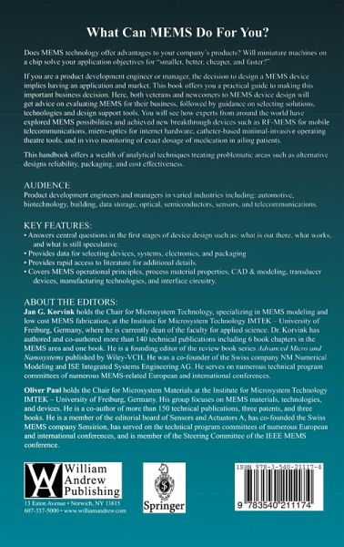 MEMS are rapidly moving from the research laboratory to the mar ketplace. Many market studies indicate not only a tremendous market potential of MEMS devices; year by year we see the actual market grow as the technology matures. In fact, these days, many large silicon foundries have a MEMS group exploring this promising technology, including such giants as INTEL and Motorola. Yet MEMS are fundamentally different from microelectronics. This means that companies with an established track record in these branches need to adapt their skills, whereas companies that want to enter the "miniaturization" market need to establish an entirely new set of capabil ities. The same can be said of engineers with classical training, who will also need to be educated toward their future professional activity in the MEMS field. Here are some questions that a company or technologist may ask: I have an existing product with miniaturization market poten tial. Which technology should I adopt? What are the manufacturing options available for miniaturiza tion? What are the qualitative differences? How do we maintainamarketleadforproductsbased onMEMS? Is there CAD support?Can we outsource manufacturing? Which skills in our current capability need only adaptation? What skills need to be added? Professors Jan Korvink and Oliver Paul have set out to answer these questions in a form that addresses the needs of companies, commercial practitioners, and technologists.