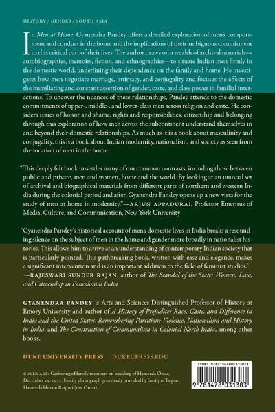 In Men at Home, Gyanendra Pandey offers a detailed exploration of men's comportment and conduct in the home and the implications of their ambiguous commitment to this critical part of their lives. The author draws on a wealth of archival materials-autobiographies, memoirs, fiction, and ethnographies-to situate Indian men firmly in the domestic world, underlining their dependence on the family and home. He investigates how men negotiate marriage, intimacy, and conjugality and focuses the effects of the humiliating and constant assertion of gender, caste, and class power in familial interactions. To uncover the nuances of these relationships, Pandey attends to the domestic commitments of upper-, middle-, and lower-class men across religion and caste. He considers issues of honor and shame, rights and responsibilities, citizenship and belonging through this exploration of how men across the subcontinent understand themselves in and beyond their domestic relationships. As much as it is a book about masculinity and conjugality, this is a book about Indian modernity, nationalism, and society as seen from the location of men in the home.