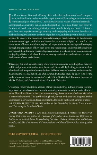 In Men at Home, Gyanendra Pandey offers a detailed exploration of men's comportment and conduct in the home and the implications of their ambiguous commitment to this critical part of their lives. The author draws on a wealth of archival materials-autobiographies, memoirs, fiction, and ethnographies-to situate Indian men firmly in the domestic world, underlining their dependence on the family and home. He investigates how men negotiate marriage, intimacy, and conjugality and focuses the effects of the humiliating and constant assertion of gender, caste, and class power in familial interactions. To uncover the nuances of these relationships, Pandey attends to the domestic commitments of upper-, middle-, and lower-class men across religion and caste. He considers issues of honor and shame, rights and responsibilities, citizenship and belonging through this exploration of how men across the subcontinent understand themselves in and beyond their domestic relationships. As much as it is a book about masculinity and conjugality, this is a book about Indian modernity, nationalism, and society as seen from the location of men in the home.