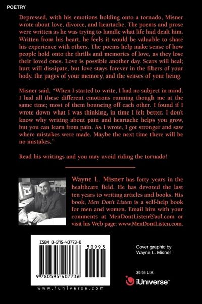 Depressed, with his emotions holding onto a tornado, Misner wrote about love, divorce, and heartache. The poems and prose were written as he was trying to handle what life had dealt him. Written from his heart, he feels it would be valuable to share his experience with others. The poems help make sense of how people hold onto the thrills and memories of love, as they lose their loved ones. Love is possible another day. Scars will heal; hurt will dissipate, but love stays forever in the fibers of your body, the pages of your memory, and the senses of your being. Misner said, "When I started to write, I had no subject in mind. I had all these different emotions running though me at the same time; most of them bouncing off each other. I found if I wrote down what I was thinking, in time I felt better. I don't know why writing about pain and heartache helps you grow, but you can learn from pain. As I wrote, I got stronger and saw where mistakes were made. Maybe the next time there will be no mistakes." Read his writings and you may avoid riding the tornado!