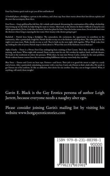 Four Gay Erotica quick reads to get you all hot and bothered A football player, a firefighter, a private in the military, and a beat cop. Four short stories about their lust-driven exploits and the men that accompany them there. First Down - Greg's girlfriend has left him. He's volatile and irritated, threatening the continuation of his college scholarship. Smartening up on the field, he helps bring his team to victory. Afterward, in the shower, he finds it difficult to keep his eyes off the quarterback, Devin. Little does he know, Devin has plans for him. Once the locker room clears, Devin heads back into the showers where Greg is enjoying the hot water. How steamy is the shower going to get? Backdraft - Patrick loves being a firefighter. The camaraderie, the excitement, the opportunity to contribute to the community. After a particularly rough fire, Patrick decides to stay on at the firehouse and sleep there. The other guy from the night's two-man team, Wade, decides to stay as well. They're both on the next night shift together. When Wade wakes him up, looking for a bit of action, Patrick stops to think about it. What if the rest of the firehouse was to find out? Alpha Charlie - Dusty is a Private First-Class undergoing basic training at Fort Carson. Their days are filled with drills, training, and classes. When night rolls around, Dusty crashes onto his cot. He's awoken by explicit, lurid, and lude dreams. He heads to the washroom to relieve the pressure. While there, he runs into Private Carlos, awoken by the same problem. Weeks without human contact have the two men seeking fulfillment with any warm body they can find. Blue Force - Darren and Curtis are beat cops. Partners-and lovers. Their job is to guard the streets at night in a seedy end of town. After a particularly stimulating encounter with a rent boy, Curtis asks Darren to find a dark alley. He needs to get Darren out of his uniform. It's like an addiction, their desire for one another. One they can no longer control. What, if anything, will satisfy them tonight?