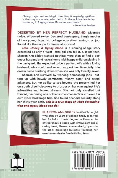 DESERTED BY HER PERFECT HUSBAND. Divorced twice. Widowed twice. Declared bankruptcy. Single mother of two young boys. No college education, savings, or job. Sound like the recipe for financial success?Men, Money & Gypsy Blood is a coming-of-age story expressed as only a West Texas girl can tell it. A 1960s teen, Sharron Ann Sibley wanted nothing more than to find a gorgeous husband and have a home with happy children playing in the backyard. She expected to be a perfect wife with a loving husband, who could and would support her financially. Her dream came crashing down when she was only twenty-seven.Sharron Ann survived by working demeaning jobs-putting up with bawdy comments, "fanny pats," and sexual advances. But her ability to see beyond the present led her on a path of self-discovery to prosper on her own against life's adversities and broken dreams. She not only excelled but thrived, becoming one of the first women in Texas to own her own stock brokerage firm. She found financial security along her thirty-year path. This is a true story of what determination and gypsy blood can do!