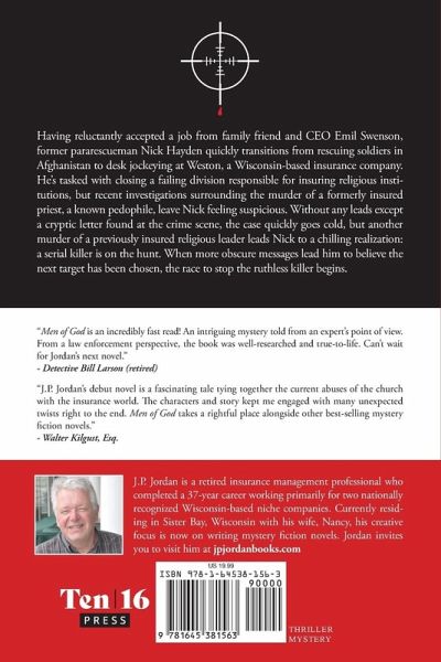 Having reluctantly accepted a job from family friend and CEO Emil Swenson, former pararescueman Nick Hayden quickly transitions from rescuing soldiers in Afghanistan to desk jockeying at Weston, a Wisconsin-based insurance company. He’s tasked with closing a failing division responsible for insuring religious institutions, but recent investigations surrounding the murder of a formerly insured priest, a known pedophile, leave Nick feeling suspicious. Without any leads except a cryptic letter found at the crime scene, the case quickly goes cold, but another murder of a previously insured religious leader leads Nick to a chilling realization: a serial killer is on the hunt. When more obscure messages lead him to believe the next target has been chosen, the race to stop the ruthless killer begins.