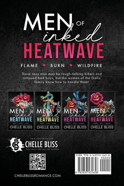 The Men of Inked Heatwave features the first three books in the USA Today bestselling spicy romantic suspense Men of Inked Heatwave series. Join the Gallo family as they search for love... FLAME (Book 1) - Gigi Gallo's childhood was filled with the roar of a motorcycle and the hum of a tattoo gun. Fresh out of college, she never expects to run into someone tall, dark, and totally sexy from her not-so-innocent past. BURN (Book 2) - Gigi Gallo thought she'd never fall in love, but then he rode into her world covered in ink and wrapped in chaos. Pike Moore never expected his past to follow him into his future, but nothing stays hidden for long. WILDFIRE (Book 3) - Tamara Gallo knew she was missing something in life. Looking for adventure, she takes off, searching for a hot biker who can deliver more than a good time. But once inside the Disciples MC compound, she gets more than she bargained for. The Men of Inked Heatwave series is filled with protective men, sassy women, and lots of heat. Get lost in the wildly popular family saga featuring tattooed bad boys, rowdy but lovable bikers, family dinners, and so much more.