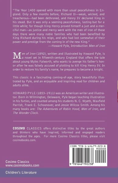 "The Year 1400 opened with more than usual peacefulness in England. Only a few months before, Richard II-weak, wicked, and treacherous-had been dethroned, and Henry IV declared King in his stead. But it was only a seeming peacefulness, lasting but for a little while; for though King Henry proved himself a just and a merciful man-as justice and mercy went with the men of iron of those day there were many noble families who had been benefited by King Richard during his reign, and who had lost somewhat of their power and prestige from the coming in of the new King." -Howard Pyle, Introduction Men of Iron Men of Iron (1892), written and illustrated by Howard Pyle, is a novel set in fifteenth-century England that offers the tale about young Myles Falworth, who wants to avenge his father's honor after he was falsely accused of plotting to kill King Henry IV. In order to restore his family's name, he prepares to become a knight. This classic is a fascinating coming-of-age, story beautifully illustrated by Pyle, and an enjoyable and inspiring read for children and adults alike.