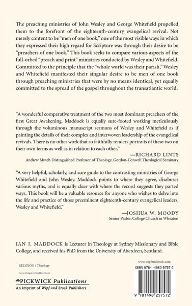 The preaching ministries of John Wesley and George Whitefield propelled them to the forefront of the eighteenth-century evangelical revival. Both self-professed "men of one book," one of the most visible ways in which they expressed their high regard for Scripture was through their desire to be "preachers of one book." This book seeks to compare various aspects of the full-orbed "preach and print" ministries conducted by Wesley and Whitefield. Committed to the principle that the "whole world was their parish," Wesley and Whitefield manifested their singular desire to be men of one book through preaching ministries that were by no means identical, yet equally committed to the spread of the gospel throughout the transatlantic world.