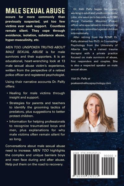 Male sexual abuse occurs far more commonly than previously suspected, yet too few victims ever seek support. Countless remain silent. They cope through avoidance, isolation, substance abuse, hyper-masculinity, etc. Men Too: Unspoken Truths About Male Sexual Abuse is for male survivors and their supporters. It is an educational, heart-wrenching look at 13 male sexual abuse victims experience, written from the perspective of a retired police officer and registered psychologist. Using their narrative accounts Dr. Palfy offers: Healing for male victims through insight and support. Strategies for parents and teachers to identify the grooming tactics of predators, plus suggestions to better protect children. Information for helping professionals to recognize traumatized boys and men, plus explanations for why male victims often remain silent for so long. Conversations about male sexual abuse need to increase. Men Too highlights the complex and unique barriers boys and men face during and after abuse. Help put them on the road to recovery.
