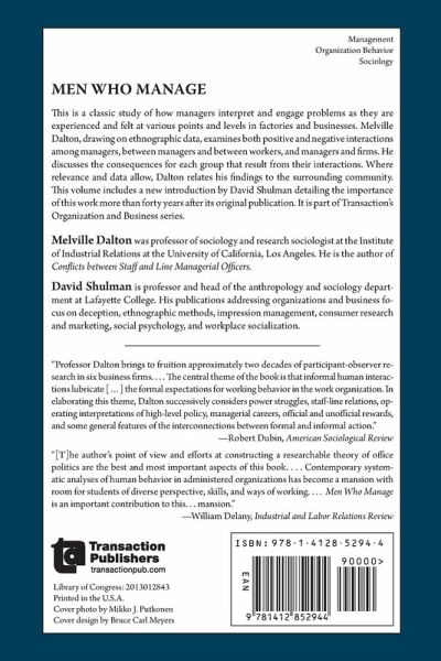 This is a classic study of how managers interpret and engage problems as they are experienced and felt at various points and levels in factories and businesses. Melville Dalton, drawing on ethnographic data, examines both positive and negative interactions among managers, between managers and between workers, and managers and firms. He discusses the consequences for each group that result from their interactions. Where relevance and data allow, Dalton relates his findings to the surrounding community.