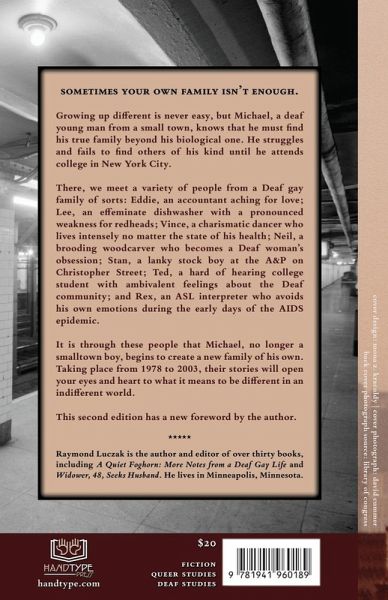 Sometimes your own family isn't enough. Growing up different is never easy, but Michael, a deaf young man from a small town, knows that he must find his true family beyond his biological one. He struggles and fails to find others of his kind until he attends college in New York City. There, we meet a variety of people from a deaf gay family of sorts: Eddie, an older accountant aching for love; Lee, an effeminate dishwasher with a pronounced weakness for red-haired men; Vince, a charismatic dancer who lives intensely no matter the state of his health; Neil, a brooding woodcarver who becomes a deaf woman's obsession; Stan, a lanky stock boy at the A&P on Christopher Street; Ted, a hard-of-hearing college student with ambivalent feelings about the deaf community; and Rex, an ASL interpreter who avoids his own emotions during the early days of the AIDS epidemic. It is through these people that Michael, no longer a smalltown boy, begins to create a new family of his own. Taking place from 1978 to 2003, his story will open your eyes and heart to what it means to be different in an indifferent world. The first place winner of the Project: QueerLit 2006 Contest, this second edition features a new foreword by the author.
