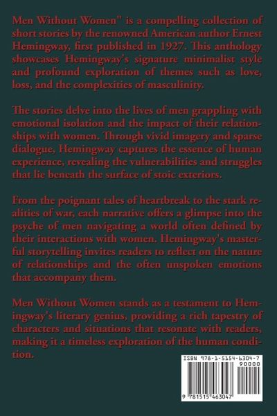 Men Without Women is a compelling collection of short stories by the renowned American author Ernest Hemingway, first published in 1927. This anthology showcases Hemingway's signature minimalist style and profound exploration of themes such as love, loss, and the complexities of masculinity. The stories delve into the lives of men grappling with emotional isolation and the impact of their relationships with women. Through vivid imagery and sparse dialogue, Hemingway captures the essence of human experience, revealing the vulnerabilities and struggles that lie beneath the surface of stoic exteriors. From the poignant tales of heartbreak to the stark realities of war, each narrative offers a glimpse into the psyche of men navigating a world often defined by their interactions with women. Hemingway's masterful storytelling invites readers to reflect on the nature of relationships and the often unspoken emotions that accompany them. Men Without Women stands as a testament to Hemingway's literary genius, providing a rich tapestry of characters and situations that resonate with readers, making it a timeless exploration of the human condition.