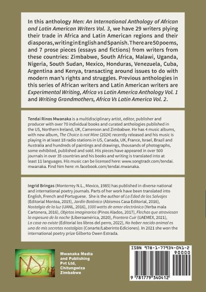 In this anthology Men: An International Anthology of African and Latin American Writers Vol. 3, we have 29 writers plying their trade in Africa and Latin American regions and their diasporas, writingin English and Spanish. Thereare 50 poems, and 7 prose pieces (essays and fictions) from writers from these countries: Zimbabwe, South Africa, Malawi, Uganda, Nigeria, South Sudan, Mexico, Honduras, Venezuela, Cuba, Argentina and Kenya, transacting around issues to do with modern man's rights and struggles. Previous anthologies in this series of African writers and Latin American writers are Experimental Writing, Africa vs Latin America Anthology Vol. 1 and Writing Grandmothers, Africa Vs Latin America Vol. 2.
