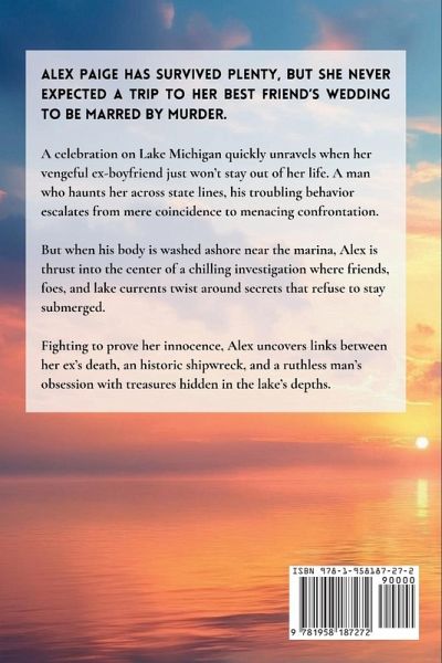Alex Piage has survived plenty, but she never expected a trip to her best friend's wedding to be marred by murder. A celebration on Lake Michigan quickly unravels when her vengeful ex-boyfriend just won't stay out of her life. A man who haunts her across state lines, his troubling behavior escalates from mere coincidence to menacing confrontation. But when Ben's body is found washed ashore near the marina, Alex is thrust into the center of a chilling investigation where friends, foes, and lake currents twist around secrets that refuse to stay submerged. Fighting to prove her innocence, Alex uncovers links between her ex's death, an historic shipwreck, and a ruthless man's obsession with treasures hidden in the lake's depths. Alex follows a dangerous trail of clues weaving from distant shores to Lake Michigan's murky waters. To survive, she must expose the killer, or risk becoming the next victim claimed by the lake.
