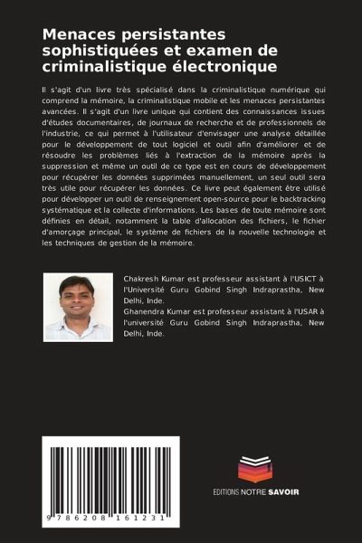 Il s'agit d'un livre très spécialisé dans la criminalistique numérique qui comprend la mémoire, la criminalistique mobile et les menaces persistantes avancées. Il s'agit d'un livre unique qui contient des connaissances issues d'études documentaires, de journaux de recherche et de professionnels de l'industrie, ce qui permet à l'utilisateur d'envisager une analyse détaillée pour le développement de tout logiciel et outil afin d'améliorer et de résoudre les problèmes liés à l'extraction de la mémoire après la suppression et même un outil de ce type est en cours de développement pour récupérer les données supprimées manuellement, un seul outil sera très utile pour récupérer les données. Ce livre peut également être utilisé pour développer un outil de renseignement open-source pour le backtracking systématique et la collecte d'informations. Les bases de toute mémoire sont définies en détail, notamment la table d'allocation des fichiers, le fichier d'amorçage principal, le système de fichiers de la nouvelle technologie et les techniques de gestion de la mémoire.