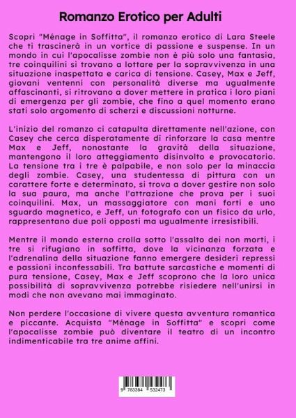 Scopri "Ménage in Soffitta", il romanzo erotico di Lara Steele che ti trascinerà in un vortice di passione e suspense. In un mondo in cui l'apocalisse zombie non è più solo una fantasia, tre coinquilini si trovano a lottare per la sopravvivenza in una situazione inaspettata e carica di tensione. Casey, Max e Jeff, giovani ventenni con personalità diverse ma ugualmente affascinanti, si ritrovano a dover mettere in pratica i loro piani di emergenza per gli zombie, che fino a quel momento erano stati solo argomento di scherzi e discussioni notturne.L'inizio del romanzo ci catapulta direttamente nell'azione, con Casey che cerca disperatamente di rinforzare la casa mentre Max e Jeff, nonostante la gravità della situazione, mantengono il loro atteggiamento disinvolto e provocatorio. La tensione tra i tre è palpabile, e non solo per la minaccia degli zombie. Casey, una studentessa di pittura con un carattere forte e determinato, si trova a dover gestire non solo la sua paura, ma anche l'attrazione che prova per i suoi coinquilini. Max, un massaggiatore con mani forti e uno sguardo magnetico, e Jeff, un fotografo con un fisico da urlo, rappresentano due poli opposti ma ugualmente irresistibili.Mentre il mondo esterno crolla sotto l'assalto dei non morti, i tre si rifugiano in soffitta, dove la vicinanza forzata e l'adrenalina della situazione fanno emergere desideri repressi e passioni inconfessabili. Tra battute sarcastiche e momenti di pura tensione, Casey, Max e Jeff scoprono che la loro unica possibilità di sopravvivenza potrebbe risiedere nell'unirsi in modi che non avevano mai immaginato."Ménage in Soffitta" non è solo un romanzo erotico, ma un'esplorazione delle dinamiche umane in situazioni estreme. Lara Steele ci regala una storia avvincente e sensuale, ricca di colpi di scena e scene di sesso esplicito che accendono la scintilla del desiderio. Immergiti in questo racconto di sopravvivenza e passione, dove l'amore e il pericolo si intrecciano in un mix esplosivo.Non perdere l'occasione di vivere questa avventura romantica e piccante. Acquista "Ménage in Soffitta" e scopri come l'apocalisse zombie può diventare il teatro di un incontro indimenticabile tra tre anime affini.