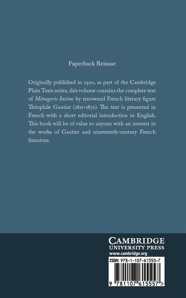 Originally published in 1920 as part of the Cambridge Plain Texts series, this volume contains the complete text of Ménagerie intime by renowned French literary figure Théophile Gautier (1811-72). The text is presented in French with a short editorial introduction in English. This book will be of value to anyone with an interest in the works of Gautier and nineteenth-century French literature.