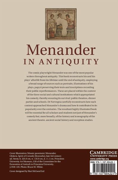 The comic playwright Menander was one of the most popular writers throughout antiquity. This book reconstructs his life and the legacy of his work until the end of antiquity employing a broad range of sources such as portraits, illustrations of his plays, papyri preserving their texts and inscriptions recording their public performances. These are placed within the context of the three social and cultural institutions which appropriated his comedy, thereby ensuring its survival: public theatres, dinner parties and schools. Dr Nervegna carefully reconstructs how each context approached Menander's drama and how it contributed to its popularity over the centuries. The resultant, highly illustrated, book will be essential for all scholars and students not just of Menander's comedy but, more broadly, of the history and iconography of the ancient theatre, ancient social history and reception studies.