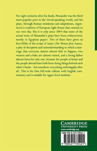 For eight centuries after his death Menander was the third most popular poet in the Greek-speaking world, and his plays, through Roman imitations and adaptations, engendered a tradition of European light drama that extends to our own day. But it is only since 1844 that some of the actual texts of Menander's plays have been rediscovered, mostly in Egyptian papyri. Two of these have given us four-fifths of the script of Samia (The Woman from Samos), a play of deception and misunderstanding in which a marriage that everyone desires almost fails to happen, two women and a baby are almost ruined, and a loving father almost loses his only son, because the people at home and the people abroad have both been doing things behind each other's backs - but somehow everything ends happily after all. This is the first full-scale edition with English commentary and is suitable for upper-level students.