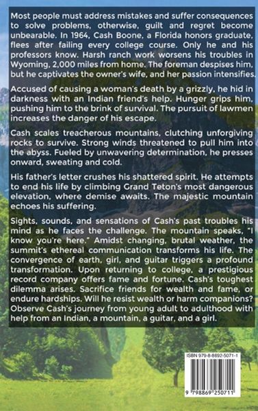 If most people don't face the consequences of harming others, they feel overwhelmed by guilt and regret. In 1964, Cash Boone, a Florida honors graduate, flees after failing every college course. Only he and his professors know. Harsh ranch work worsens his troubles in Wyoming, 2,000 miles from home. The foreman despises him, but the owner's wife desires him, and her passion intensifies. Accused of causing a woman's death by a grizzly, he hides in darkness with an Indian friend's help. Hunger grips him, pushing him to the brink of survival. The pursuit of lawmen increases the danger of his escape. Cash scales treacherous mountains, clutching unforgiving rocks to survive. Strong winds threatened to pull him into the abyss. Fueled by unwavering determination, he presses onward, sweating and cold. His father's letter crushes his shattered spirit. He attempts to end his life by climbing Grand Teton's most dangerous elevation, where demise awaits. The majestic mountain echoes his suffering. Sights, sounds, and sensations of Cash's past troubles his mind as he faces the challenge. The mountain speaks. "I know you're here." Amidst changing, brutal weather, the summit's ethereal communication transforms his life. The convergence of nature, earth, a girl, and a guitar, once a cause of his failures, triggers a profound transformation. Upon returning to college, a prestigious record company offers fame and fortune, but Cash's toughest dilemma arises. Sacrifice friends for wealth and fame, or endure hardships. Will he resist wealth or harm companions? Observe Cash's amazing journey from new adult to adulthood with help from an Indian, Mother Earth, a mountain, a guitar, and a girl.
