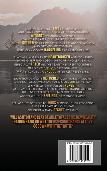 Ashton Carpenter left her boyfriend and small-town behind just after graduation without so much as a word.Now, years later, she has no other choice but to return to her roots. She has plans to lay low and get her life together until Clay comes barreling back into her life.Clay Williams was left heartbroken and confused by his girlfriend's decision to up and leave him, especially after all the years they spent together. He's grown into a heartless man who still holds a grudge after all these years.Now that Ashton's returned, Clay makes it known she's not welcomed back and goes out of his way to make sure she doesn't forget it.As Clay tries his hardest to continue hating Ashton, the tension between them begins to fester along with the feelings they once shared.Yet, as they both try to work through their emotions, the past rears its ugly head, bringing a dark secret to light.Will Ashton and Clay be able to face this new reality hand in hand, or will their second chance at love go down with the truth?