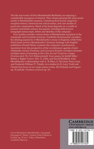 The life and works of Felix Mendelssohn Bartholdy are enjoying a considerable resurgence of interest. This volume presents the most recent trends in Mendelssohn research, examining three broad categories - reception history, historical and critical essays, and case studies of particular compositions. Much of the book depends on a wealth of primary nineteenth-century documents, including little-known autograph manuscripts, letters and sketches of the composer. Four studies consider various facets of Mendelssohn reception in the nineteenth and twentieth centuries. Friedhelm Krummacher considers the abiding popularity of Mendelssohn's music in England, while Peter Ward Jones reviews Mendelssohn's business dealings with English publishers; Donald Mintz examines the composer's posthumous reputation from the perspective of the revolutionary agenda of mid-nineteenth-century Germany; and Lawrence Kramer considers dynamic multiple layers of meaning in the Calm Sea and Prosperous Voyage Overture and The First Walpurgisnight. Four essays, by Judith Silber Ballan, J. Rigbie Turner, Wm. A. Little, and David Brodbeck, treat Mendelssohn's relationships with A. B. Marx, E. Devrient, Franz Liszt, and Frederick William IV. Finally, two studies by R. Larry Todd and Christa Jost focus on two major piano works, the Preludes and Fugues op. 35 and the Variations serieuses op. 54.