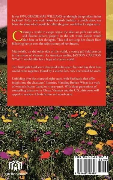 Do you remember when you lost your innocence? I do... It was 1969, GRACIE MAE WILLIAMS ran through the sprinklers in her backyard. Today, one week before her sixth birthday, a terrible abuse was born. An abuse which would be called the game, would last for eight years. Creating a world to escape where the skies are pink and yellow, and happy dancing flowers move gingerly in the soft wind, Gracie would hide here in her thoughts. Hoping to hold on to what little innocence she still had remaining, her abuser would continue to follow her to even the safest corners of her dreams. Meanwhile, on the other side of the world, a young girl sold peanuts in the streets of Vietnam. An American soldier, JAXTON CARLTON WYATT would offer her a hope of better things to come. Two little girls lived seven thousand miles apart, but one day their lives would come together. Joined by a shared fate, only one would be saved. Unfolding over the course of eight years, with flashbacks that offer insight into the characters' histories, Mending Broken Wings is a work of women's fiction (based on true events) With three generations of compelling drama set in China, Vietnam and the U.S., this novel will appeal to readers of both fiction and non-fiction.