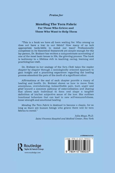 The analogy of the torn fabric was first used by the author in response to a bereaved mother's cry: "I know what grief feels like; I don't know what it looks like." In "Mending the Torn Fabric: For Those Who Grieve and Those Who Want to Help Them", the author expands the metaphor to include earlier and future or potential losses as well as losses associated with the death that may be unrecognized or minimized. This book includes chapters that examine complications that may be present or may arise, suggestions for mending even the most torn fabric, and a chapter dedicated to friends who want to help. Stories bereaved persons have shared with the author through the years are interspersed throughout the book to provide examples of loss and mending.