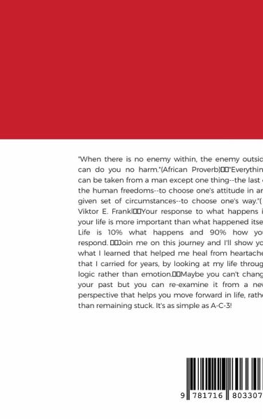 "When there is no enemy within, the enemy outside can do you no harm." - African Proverb "Everything can be taken from a man except one thing--the last of the human freedoms--to choose one's attitude in any given set of circumstances--to choose one's way." - Viktor E. Frankl Your response to what happens in your life is more important than what happened itself. Life is 10% what happens and 90% how you respond. Join me on this journey and I'll show you what I learned that helped me heal from heartaches that I carried for years, by looking at my life through logic rather than emotion. You can put the pain of your broken heart behind you, and lose those feelings of pain, hopelessness, and despair. I got back in the game, and so can you. It's as simple as A-C-3!