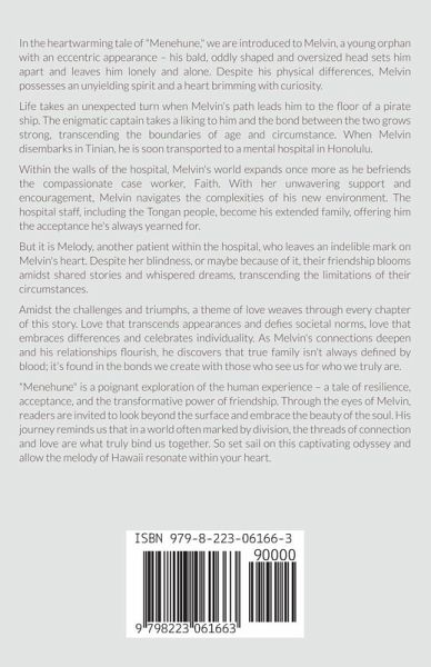 In the heartwarming tale of "Menehune," we are introduced to Melvin, a young orphan with an eccentric appearance – his bald, oddly shaped and oversized head sets him apart and leaves him lonely and alone. Despite his physical differences, Melvin possesses an unyielding spirit and a heart brimming with curiosity. Life takes an unexpected turn when Melvin's path crosses with that of a fearsome pirate ship. Through a series of events leaving him running for his life, Melvin finds himself aboard the very vessel that strikes terror into the hearts of sailors across the seas. It's a twist of fate that will forever alter his destiny. As Melvin adjusts to life aboard the pirate ship, the enigmatic captain, a grizzled seafarer with a hidden softness beneath his tough exterior, takes a liking to him. The bond between the two grows strong, transcending the boundaries of age and circumstance. The captain, in his desire to do the right thing for young, innocent Melvin, leaves him at their next stop, on the shores of Tinian. Against a backdrop of turquoise waters and lush landscapes, he encounters the mysteries of a new land. Yet, his arrival in Tinian brings unforeseen challenges, leading him to a mental hospital outside of Honolulu. Within the walls of the hospital, Melvin's world expands once more as he befriends the compassionate case worker, Faith. With her unwavering support and encouragement, Melvin navigates the complexities of his new environment. The hospital staff, including the Tongan people, become his extended family, offering him the acceptance he's always yearned for. But it is Melody, another patient within the hospital, who leaves an indelible mark on Melvin's heart. Despite her blindness, or maybe because of it, their friendship blooms amidst shared stories and whispered dreams, transcending the limitations of their circumstances. Amidst the challenges and triumphs, a theme of love weaves through every chapter of this story. Love that transcends appearances and defies societal norms, love that embraces differences and celebrates individuality. As Melvin's connections deepen and his relationships flourish, he discovers that true family isn't always defined by blood; it's found in the bonds we create with those who see us for who we truly are. "Menehune" is a poignant exploration of the human experience – a tale of resilience, acceptance, and the transformative power of friendship. Through the eyes of Melvin, readers are invited to look beyond the surface and embrace the beauty of the soul. This heartwarming journey reminds us that in a world often marked by division, the threads of connection and love are what truly bind us together. So set sail on this captivating odyssey and allow the melody of the seas to resonate within your heart.