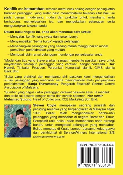 Konflik dan kemarahan semakin memuncak seiring dengan peningkatan harapan pelanggan, yang sudah pasti menambahkan tekanan kita! Buku ini padat dengan modelyang mudah dan praktikal untuk membantu anda berhubung, menyelesaikan isu, dan mengekalkan pelanggan serta mengurangkan tekanan anda. Dalam buku ringkas ini, anda akan menemui cara untuk: - Mengatasi konflik yang nyata dan tersembunyi. - Menyampaikan 'berita buruk' kepada pelanggan. - Menenangkan pelanggan yang sedang marah menggunakan model pemulihan perkhidmatan yang mudah. - Membuat lebih ramai pelanggan mendengar penyelesaian anda. Buku ringkas (173 muka surat) ini padat dengan model-model praktikal yang digabungkan dengan pelbagai tip, contoh dan cerita tentang cara mengendalikan individu yang cerewet. Matlamat buku ini adalah untuk membantu anda menenangkan pelanggan yang mencabar, mengekalkan pelanggan DAN mengurangkan tekanan anda. Walaupun tumpuan diberikan kepada pelanggan, kebanyakan konsep yang dikongsikan sesuai digunakan dalam kehidupan seharian seperti dengan bos, keluarga, pasangan, rakan, pelajar dan lain-lain. Penulis percaya bahawa konflik yang tidak ganas selalunya mempunyai kebaikan. Anda boleh mengatasinya dengan mentaliti yang betul. Penulis memperoleh kepakaran dalam mengendalikan konflik dan pelanggan yang mencabar semasa bekerja dalam industri perbankan dan telekomunikasi, terutamanya semasa bekerja sebagai pengutip hutang di mana beliau berhadapan dengan pelanggan pada tahap terburuk mereka. Beliau telah menetap dan mengembara ke lebih 40 negara dan akan berkongsi pengalaman uniknya dalam mengendalikan pelbagai jenis pelanggan.