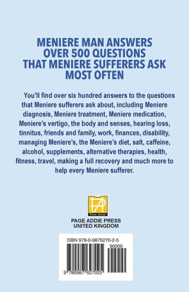 Q: Can I die from Meniere's? Q: When can I expect Meniere's to go away? Q:Will I ever get better? Q:What causes Meniere's? Q: Does no known cure mean you can never get better? Q: How bad can it get? Q: Is every person's experience of Meniere's the same? Q: Is Meniere's disease curable or do you have Meniere's for life? 'The Meniere Answer Book' is one of the most essential self-help books ever written for those who have Meniere's and those who share their lives with someone who has it. Meniere Man, a Meniere's survivor, mentor and widely published best-selling author on Meniere's disease, answers the questions asked most often. Everything Meniere sufferers want and need to know including personal questions he answers as a Meniere survivor such as: Q: What kind of Meniere's disease did you have? Q: How long since you recovered from Meniere's? Q: How important was it to be proactive for a recovery? Q: You had two vitamin and supplement regimes. Can you explain? Q: What exactly was your three-month booster regime? Q: Which alternative medicine treatments did you try to help relieve symptoms of Meniere's disease? Q: Do you consider yourself lucky to have recovered from Meniere's? So whether you are newly diagnosed with Meniere's or have lived with Meniere's for years and want to get better the Meniere Man way, you'll find the answers you need: facts, sage personal advice, research, helpful insights, proven experiential tips and time-proven self-help techniques from the desk of Meniere Man who knows Meniere's as the meniere survivor he has been for nearly two decades. You'll find hundreds of answers to the questions about Meniere diagnosis; Meniere treatment; Meniere medication; Meniere's vertigo, the body and senses, hearing loss, tinnitus, friends and family, work, finances, disability, managing Meniere's, the Meniere's diet, salt, caffeine, alcohol, supplements, alternative therapies, health, fitness, travel, getting better, making a full recovery and much more. Written in an easy to read Q&A style. Similar tags: meniere disease, menieres disease, vertigo, vertigo symptoms, vertigo causes, meniere treatment, inner ear, vestibular, low-sodium, low-salt, symptoms, hearing loss, tinnitus, dizziness, dizzy, balance disorder, recurrent attacks, fluctuating hearing, sensorineural, hearing loss, affected ear, menieres diet.
