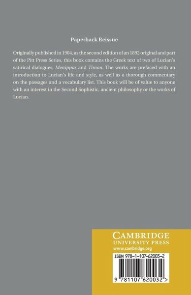 Originally published in 1904, as the second edition of an 1892 original and part of the Pitt Press Series, this book contains the Greek text of two of Lucian's satirical dialogues, Menippus and Timon. The works are prefaced with an introduction to Lucian's life and style, as well as a thorough commentary on the passages and a vocabulary list. This book will be of value to anyone with an interest in the Second Sophistic, ancient philosophy or the works of Lucian.