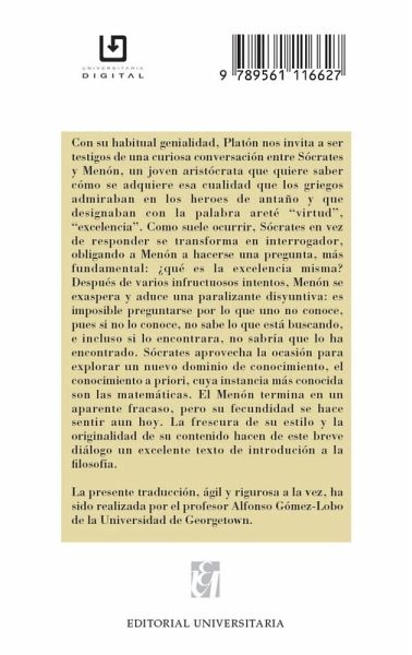 Con su habitual genialidad, Platón nos invita a ser testigos de una curiosa conversación entre Sócrates y Menón, un joven aristócrata que quiere saber cómo se adquiere esa cualidad que los griegos admiraban en los heroes de antaño y que designaban con la palabra areté "virtud", "excelencia". Como suele ocurrir, Sócrates en vez de responder se transforma en interrogador, obligando a Menón a hacerse una pregunta, más fundamental: ¿qué es la excelencia misma? Después de varios infructuosos intentos, Menón se exaspera y aduce una paralizante disyuntiva: es imposible preguntarse por lo que uno no conoce, pues si no lo conoce, no sabe lo que está buscando, e incluso si lo encontrara, no sabría que lo ha encontrado. Sócrates aprovecha la ocasión para explorar un nuevo dominio de conocimiento, el conocimiento a priori, cuya instancia más conocida son las matemáticas. El Menón termina en un aparente fracaso, pero su fecundidad se hace sentir aun hoy. La frescura de su estilo y la originalidad de su contenido hacen de este breve diálogo un excelente texto de introdución a la filosofía.