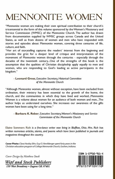Elaine Sommers Rich received her M.A. from Michigan State University. She has written for Mennonite publications and has authored, among other titles, Mennonite Women and the novel Hannah Elizabeth. Elaine and her husband, Ronald L. Rich, a retired professor of chemistry, have four grown children and four grandchildren. They live in Bluffton, Ohio. In addition to rearing her family and writing, Elaine has taught part-time at colleges and universities in Indiana, Kansas, Ohio, and Japan. Contributors: Helen Wade Alderfer, Helen Good Brenneman, Lois Gunden Clemens, Esther Eby Glass, Minnie Swartzendruber Graber, Miriam Sieber Lind, Dorothy Snapp McCannon, Ethel Yake Metzler, Elaine Sommers Rich, Barbara Claassen Smucker, Winifred Schlosser Waltner, and Grace Wenger.
