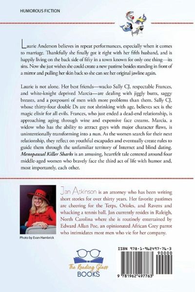 Synopsis: Laurie Anderson believes in repeat performances, especially when it comes to marriage. Thankfully, she finally got it right with her fifth husband and is happily living on the side of fifty in a town known for only one thing-its sins. Now she just wishes she could create a new pastime besides standing in front of a mirror and pulling her skin back so she can see her original jawline again. Laurie is not alone. Her best friends-wacko Sally CJ, respectable Frances, and white-knight deprived Marcia-are dealing with jiggly butts, saggy breasts, and a potpourri of men with more problems than them. Sally CJ, whose thirty-four double Ds are not shrinking with age, believes sex is the magic elixir for all evils. Frances, who just ended a dead-end relationship, is approaching aging through wine and expensive face creams. Marcia, a widow who has the ability to attract guys with major character flaws, is unintentionally transforming into a nun. As the women search for their next relationship, they reflect on youthful escapades and eventually create rules to guide them through the unfamiliar territory of the Internet and blind dating. Menopausal Killer Sharks is an amusing, heartfelt tale centered around four middle-aged women who bravely face the third act of life with humor and, most importantly, each other. Autobiography: Jan Atkinson is an attorney who has been writing short stories for over thirty years. Her favorite pastimes are cheering for the Terps, Orioles, and Ravens and whacking a tennis ball. Jan currently resides in Raleigh, North Carolina where she is routinely entertained by Edgar Allan Poe, an opinionated African Grey parrot who intimidates most men who vie for her company.