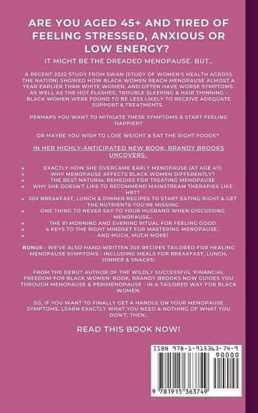 Are you aged 45+ and tired of feeling stressed, anxious, or low energy? It might be the dreaded menopause. But.. A recent 2022 study from SWAN (Study of Women's Health Across the Nation) showed that Black Women reach menopause almost a year earlier than white women, and often have worse symptoms. As well as the hot flashes, trouble sleeping & hair thinning - Black Women were found to be less likely to receive adequate support & treatments. Perhaps you want to mitigate these symptoms & start feeling happier? Or maybe you wish to lose weight & eat the right foods? In her highly-anticipated new book, Brandy Brooks uncovers: Why menopause affects Black Women differently? The best natural remedies for treating menopause Why she doesn't like to recommend mainstream therapies like HRT? 20x breakfast, lunch & dinner recipes to start eating right & get the nutrients you're missing One thing to NEVER say to your husband when discussing menopause.. Exactly how she overcame early menopause (at age 40!) The #1 morning and evening rituals for feeling good 4 keys to the right mindset for mastering menopause.. And much, much more! BONUS - We've also hand-written 20 recipes tailored for healing menopause symptoms - including meals for breakfast, lunch, dinner & snacks! From the debut author of the wildly successful 'Financial Freedom for Black Women' book, Brandy Brooks now guides you through Menopause & Perimenopause - in a book written just for Black Women. So, if you want to finally get a handle on your menopause symptoms, start eating right and feeling healthier.. Order this book now!