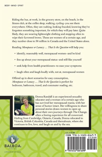 Riding the bus, at work, in the grocery store, on the beach, in the fitness club, at the coffee shop, walking, cycling-you see them everywhere. Often, they are rushing, looking frazzled, knowing they've forgotten something important, for which they will pay later. Quite likely, they are wearing lightweight clothing and stopping often to wipe their furrowed brows. These are women-of-a-certain-age, and they number close to 50 million in Canada and the United States alone. Reading Menopause or Lunacy ... That Is the Question will help you: identify, reasonably well, menopausal women-and be kind fess up about your menopausal status-and still like yourself seek help from health practitioners-to ease your symptoms laugh often and laugh loudly with, not at, menopausal women Offered up in short scenarios for easy consumption, Menopause or Lunacy ... That Is the Question is perfect for bedroom, bathroom, travel, and commuter reading, etc.