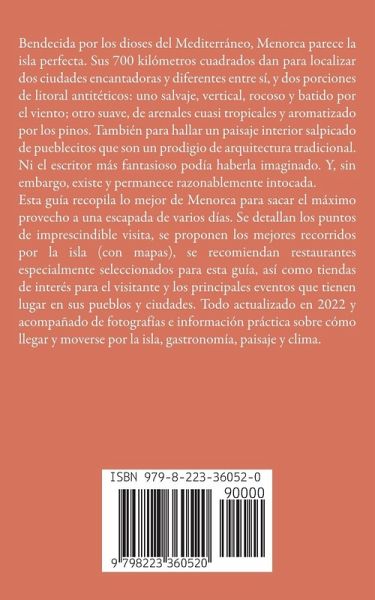 Bendecida por los dioses del Mediterráneo, Menorca parece la isla perfecta. Sus 700 kilómetros cuadrados dan para localizar dos ciudades encantadoras y diferentes entre sí, y dos porciones de litoral antitéticos: uno salvaje, vertical, rocoso y batido por el viento; otro suave, de arenales cuasi tropicales y aromatizado por los pinos. También para hallar un paisaje interior salpicado de pueblecitos que son un prodigio de arquitectura tradicional. Ni el escritor más fantasioso podía haberla imaginado. Y, sin embargo, existe y permanece razonablemente intocada. Esta guía recopila lo mejor de Menorca para sacar el máximo provecho a una escapada de varios días. Se detallan los puntos de imprescindible visita, se proponen los mejores recorridos por la isla (con mapas), se recomiendan restaurantes especialmente seleccionados para esta guía, así como tiendas de interés para el visitante y los principales eventos que tienen lugar en sus pueblos y ciudades. Todo actualizado en 2022 y acompañado de fotografías e información práctica sobre cómo llegar y moverse por la isla, gastronomía, paisaje y clima.