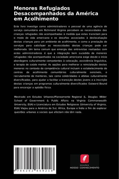 Este livro investiga como administradores e pessoal de uma agência de serviço comunitário em Richmond Virginia percebem as necessidades das crianças refugiadas não acompanhadas à medida que estas transitam para o modo de vida americano e os desafios associados à deslocalização destas crianças para um ambiente de acolhimento, e como a prestação de serviços para satisfazer as necessidades destas crianças pode ser melhorada. Um tema comum que emergiu das entrevistas realizadas com estes administradores é que a integração bem sucedida de menores refugiados não acompanhados na sociedade americana exige desde o início abordagens culturalmente competentes à colocação, assistência linguística, e terapia de saúde mental. As opções para melhorar a reinstalação destes menores no contexto da competência cultural incluem o estabelecimento de centros de acolhimento comunitários culturalmente sensíveis, o recrutamento de mentores, tais como celebridades e atletas culturalmente diversificados, para ajudar a facilitar a transição destes jovens e a inscrição destas crianças em programas culturalmente diversificados Outward Bound para encorajar a aptidão física.