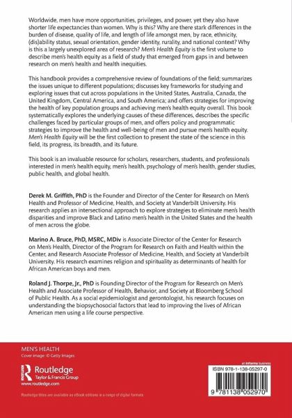 Worldwide, men have more opportunities, privileges, and power, yet they also have shorter life expectancies than women. Why is this? Why are there stark differences in the burden of disease, quality of life, and length of life amongst men, by race, ethnicity, (dis)ability status, sexual orientation, gender identity, rurality, and national context? Why is this a largely unexplored area of research? Men's Health Equity is the first volume to describe men's health equity as a field of study that emerged from gaps in and between research on men's health and health inequities.