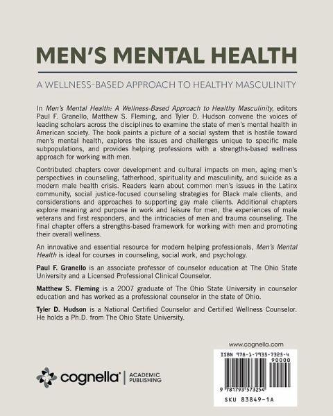 In Men's Mental Health: A Wellness-Based Approach to Healthy Masculinity, editors Paul F. Granello, Matthew S. Fleming, and Tyler D. Hudson convene the voices of leading scholars across the disciplines to examine the state of men's mental health in American society. The book paints a picture of a social system that is hostile toward men's mental health, explores the issues and challenges unique to specific male subpopulations, and provides helping professions with a strengths-based wellness approach for working with men. Contributed chapters cover development and cultural impacts on men, aging men's perspectives in counseling, fatherhood, spirituality and masculinity, and suicide as a modern male health crisis. Readers learn about common men's issues in the Latinx community, social justice-focused counseling strategies for Black male clients, and considerations and approaches to supporting gay male clients. Additional chapters explore meaning and purpose in work and leisure for men, the experiences of male veterans and first responders, and the intricacies of men and trauma counseling. The final chapter offers a strengths-based framework for working with men and promoting their overall wellness. An innovative and essential resource for modern helping professionals, Men's Mental Health is ideal for courses in counseling, social work, and psychology.
