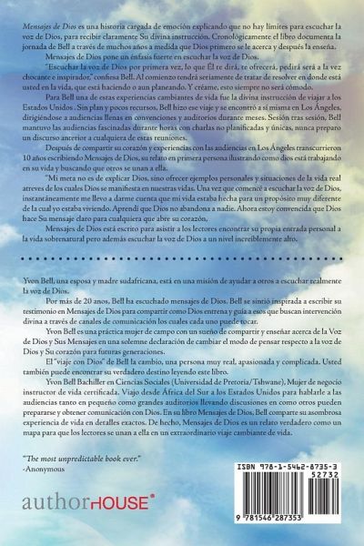 Yvon Bell, una esposa y madre sudafricana, est en una misin de ayudar a otros a escuchar realmente la voz de Dios. Por ms de 20 anos, Bell ha escuchado mensajes de Dios. Bell se sinti inspirada a escribir su testimonio en Mensajes de Dios para compartir como Dios entrena y gua a esos que buscan intervencin divina a travs de canales de comunicacin los cuales cada uno puede tocar. Yvon Bell es una prctica mujer de campo con un sueo de compartir y ensear acerca de la Voz de Dios y Sus Mensajes en una solemne declaracin de cambiar el modo de pensar respecto a la voz de Dios y Su corazn para futuras generaciones. El viaje con Dios de Bell la cambio, una persona muy real, apasionada y complicada. Usted tambin puede encontrar su verdadero destino leyendo este libro. Yvon Bell Bachiller en Ciencias Sociales (Universidad de Pretoria/Tshwane), Mujer de negocio instructor de vida certificada. Viajo desde frica del Sur a los Estados Unidos para hablarle a las audiencias tanto en pequeo como grandes auditorios llevando discusiones en como otros pueden prepararse y obtener comunicacin con Dios. En su libro Mensajes de Dios, Bell comparte su asombrosa experiencia de vida en detalles exactos. De hecho, Mensajes de Dios es un relato verdadero como un mapa para que los lectores se unan a ella en un extraordinario viaje cambiante de vida.