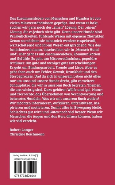Robert Langer & Christine Reichmann Robert Langer arbeitete viele Jahre als Sportlehrer und Übungsleiter. Schon immer zog ihn das klare Wesen von Tieren ¿ insbesondere von Hunden und Wölfen ¿ an. So war es für ihn nur logisch, dass er mit den Jahren Schritt für Schritt den Sport verließ und sich Tieren zuwendete. Als Hundetrainer und Tierrechtler unterstützt er Tierheime und Tierschutzorganisationen. Seine Schwerpunkte sind große Hundegruppen, Menschen mit Jagd- und/oder Tierschutzhunden, Igel in Not, Pelztierfarmen und veganes Leben. Christine Reichmann ist Politikwissenschaftlerin. Sie arbeitet als freie Journalistin und Texterin für Rundfunk, Tageszeitungen, Agenturen und Unternehmen. Ihre Hündinnen Emmy und Juli brachten sie dazu, in die Welt der Caniden einzutauchen. Am Herzen liegen ihr die Themen Jagd- und Tierschutzhunde, große Hundegruppen, die Bedeutung des Hundes in unserer Gesellschaft sowie das vegane Leben.