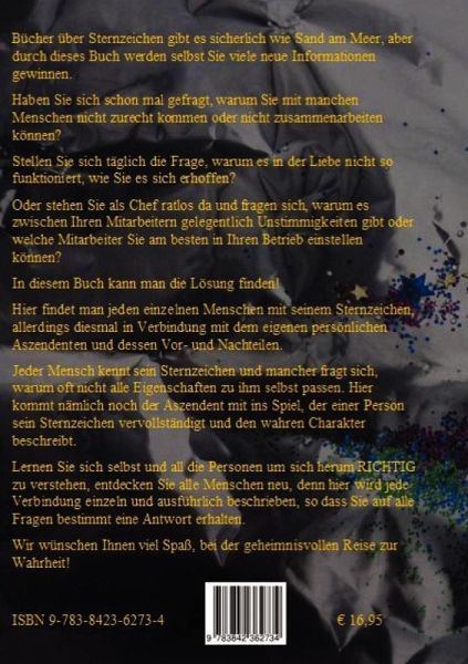 Bücher über Sternzeichen gibt es sicherlich wie Sand am Meer, aber durch dieses Buch werden selbst Sie viele neue Informationen gewinnen. Haben Sie sich schon mal gefragt, warum Sie mit manchen Menschen nicht zurecht kommen oder nicht zusammenarbeiten können?Stellen Sie sich täglich die Frage, warum es in der Liebe nicht so funktioniert, wie Sie es sich erhoffen?Oder stehen Sie als Chef ratlos da und fragen sich, warum es zwischen Ihren Mitarbeitern gelegentlich Unstimmigkeiten gibt oder welche Mitarbeiter Sie am besten in Ihren Betrieb einstellen können?In diesem Buch kann man die Lösung finden!Hier findet man jeden einzelnen Menschen mit seinem Sternzeichen, allerdings diesmal in Verbindung mit dem eigenen persönlichen Aszendenten und dessen Vor- und Nachteilen.Jeder Mensch kennt sein Sternzeichen und mancher fragt sich, warum oft nicht alle Eigenschaften zu ihm selbst passen. Hier kommt nämlich noch der Aszendent mit ins Spiel, der einer Person sein Sternzeichen vervollständigt und den wahren Charakter beschreibt. Lernen Sie sich selbst und all die Personen um sich herum RICHTIG zu verstehen, entdecken Sie alle Menschen neu, denn hier wird jede Verbindung einzeln und ausführlich beschrieben, so dass Sie auf alle Fragen bestimmt eine Antwort erhalten.Wir wünschen Ihnen viel Spaß, bei der geheimnisvollen Reise zur Wahrheit!