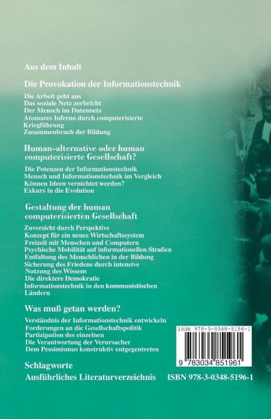 Allzulange wurde in der Bundesrepublik Deutschland die Dimension des Wandels, der mit der Verbreitung neuer Inf- mations- und Kommunikationstechniken verbunden ist, unt- schätzt. Den einen galt der Computer nur als eine neue tech- sche Spielart, deren Integration in den Alltag des einzelnen p- blemlos zu bewältigen sei. Andere glaubten, unsere Gesellschaft gänzlich vor den neuen Technologien "bewahren" zu können, wenn ihre unterstellten negativen Auswirkungen nur lange und undifferenziert genug postuliert würden. Beide Positionen haben sich als falsch und der konzept- nellen Aufarbeitung der Problembereiche nicht dienlich erw- sen. Die Technik ist da, sie erfaßt mit immer größerer Verän- rungsgeschwindigkeit fundamentale Lebenszusammenhänge und schafft unumstößliche Fakten. Politik und Gesellschaft hingegen stehen erst am Anfang des mühseligen Weges, wirtschaftliche und soziale Anpassungsformen zu finden und nach neuen Leitb- dern zu suchen. In diesem Buch wird die zu erwartende technische Entwi- lung konsequent in den politischen, wirtschaftlichen, kulturellen und sozialen Raum hinein weitergedacht. Insofern ist es ein n- wendiges, freilich auch ein notwendig-unbequemes Buch. Viele Folgerungen erscheinen, in ihrer radikalen Abweichung von - wohnten Denkmustern, zunächst erschreckend. Daß ihnen jedoch ein hohes Maß an systematischer Logik innewohnt, erkennt schnell, wer versucht, mit rationalen Argumenten zu anderen Ergebnissen zu gelangen.