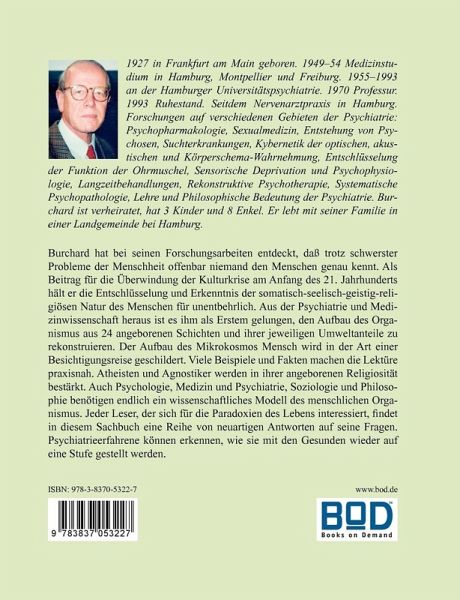 Burchard hat bei seinen Forschungsarbeiten entdeckt, daß trotz schwerster Probleme der Menschheit offenbar niemand den Menschen genau kennt. Als Beitrag für die Überwindung der Kulturkrise am Anfang des 21. Jahrhunderts hält er die Entschlüsselung und Erkenntnis der somatisch-seelisch-geistig-religiösen Natur des Menschen für unentbehrlich. Aus der Psychiatrie und Medizinwissenschaft heraus ist es ihm als Erstem gelungen, den Aufbau des Organismus aus 24 angeborenen Schichten und ihrer jeweiligen Umweltanteile zu rekonstruieren. Der Aufbau des Mikokosmos Mensch wird in der Art einer Besichtigungsreise geschildert. Viele Beispiele und Fakten machen die Lektüre praxisnah. Atheisten und Agnostiker werden in ihrer angeborenen Religiosität bestärkt. Auch Psychologie, Medizin und Psychiatrie, Soziologie und Philosophie benötigen endlich ein wissenschaftliches Modell des menschlichen Organismus. Jeder Leser, der sich für die Paradoxien des Lebens interessiert, findet in diesem Sachbucheine Reihe von neuartigen Antworten auf seine Fragen. Psychiatrieerfahrene können erkennen, wie sie mit den Gesunden wieder auf eine Stufe gestellt werden.